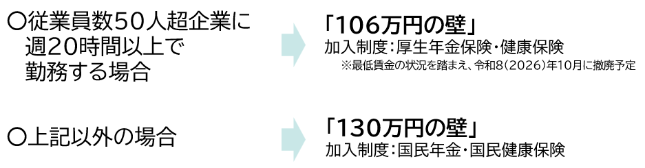 ・「従業員50人超企業に週20時間以上で勤務する場合」は、所定内賃金が月額8.8万円以上(年収換算で約106万円)になると厚生年金保険等に加入。