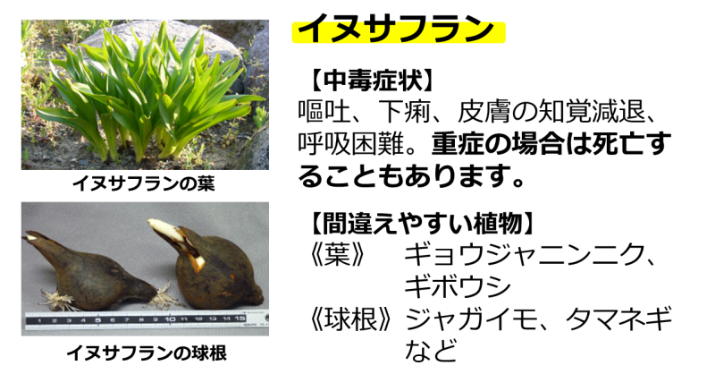 観賞用植物のイヌサフランも、葉や球根がさまざまな植物に似ているので注意が必要です。