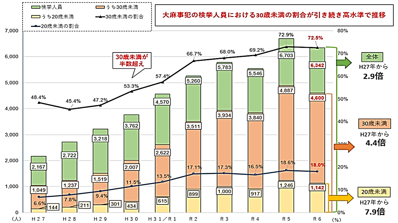 また、令和6年の検挙人員のうち、30歳未満の若年層の割合が72.5%を記録するなど、若年層の大麻の乱用が深刻な事態となっています。
