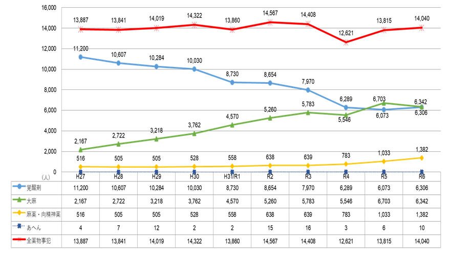 その中でも大麻は、検挙人員が過去最多を更新した令和5年より減少はしたものの6,000人を超え、引き続き高い数値となっています。